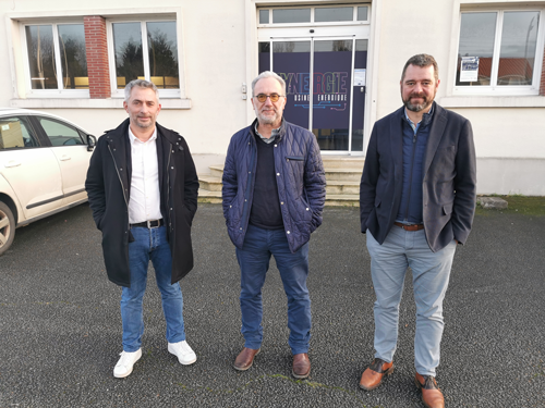 Guillaume Charrier, directeur du Pôle Développement Mauges Communauté, Franck AUBIN, vice-président du Pôle Développement Mauges Communauté et Denis Le Gall, délégué régional des Compagnons du devoir, le 15 décembre 2023 devant les bâtiments de Synergie à St-Pierre-Montlimart / Montrevault-sur-Èvre