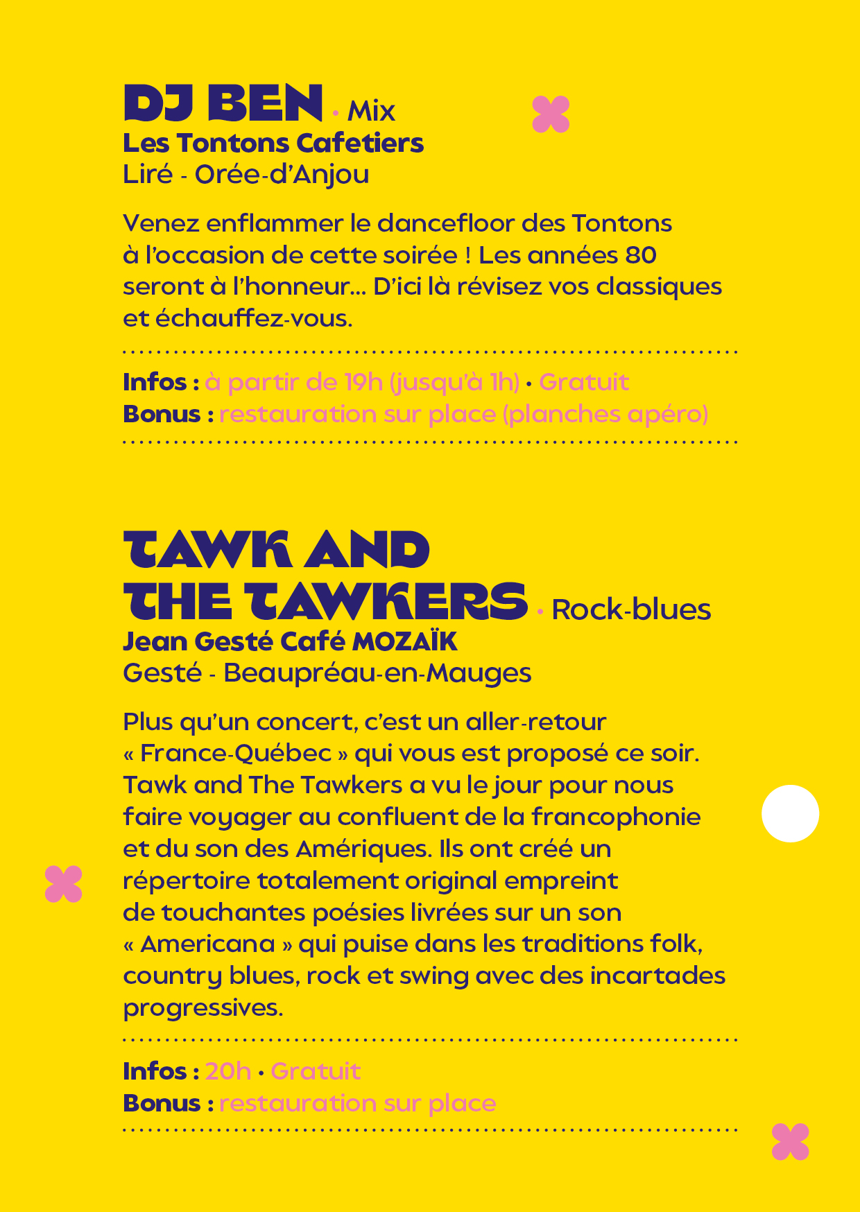 Un nouvel évènement pour fédérer les établissements autour de la musique et de l’organisation de concerts aux 4 coins des Mauges ! Impulsé et coordonné par Mauges Communauté, il est réalisé en partenariat avec les bars et cafés des Mauges.