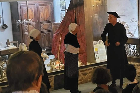Dans une 1re partie « historique », après une présentation de la vie des habitants de la commune de St-Laurent à l’été 1791, vous découvrirez dans une 1re saynète, le vicaire de la paroisse, l’abbé MOREAU expliquant aux sœurs du Chirurgien Sébastien CADY le bouleversement déclenché par la Révolution. Dans une 2e saynète, sur l’esplanade de la chapelle de Notre-Dame-de-Charité, des paroissiens raconteront la démolition de l’oratoire, le lundi 29 août 1791. Selon la tradition orale, c’est à partir de la mi-septembre 1791 que la Sainte-Vierge serait apparue, d’abord à 3 petites filles, puis ensuite à plusieurs reprises, à des milliers de pèlerins…