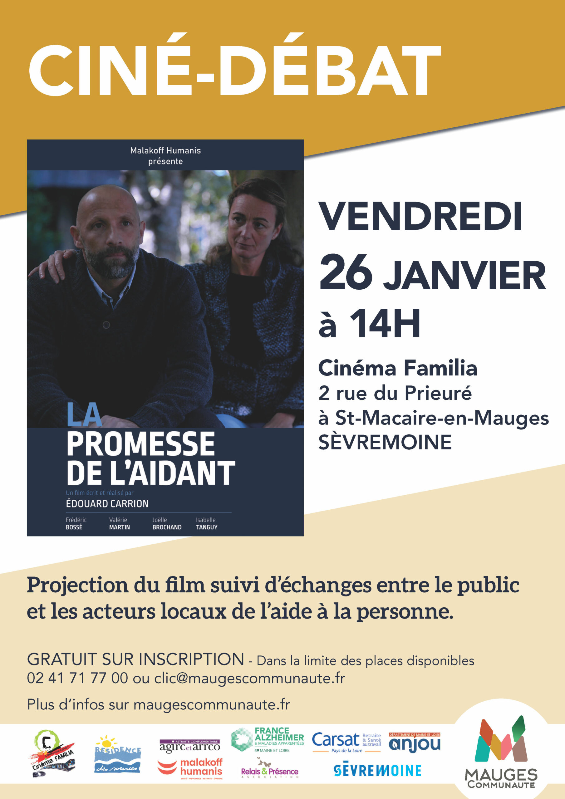 En France, 11 millions de personnes prennent soin d’un proche fragilisé. Pour sensibiliser les aidants, mais aussi le grand public sur les réalités parfois difficiles qui composent la vie de ceux qui assument au quotidien ce rôle primordial, le CLIC de Mauges Communauté et Malakoff Humanis vous proposent un ciné-débat sur le thème des aidants.