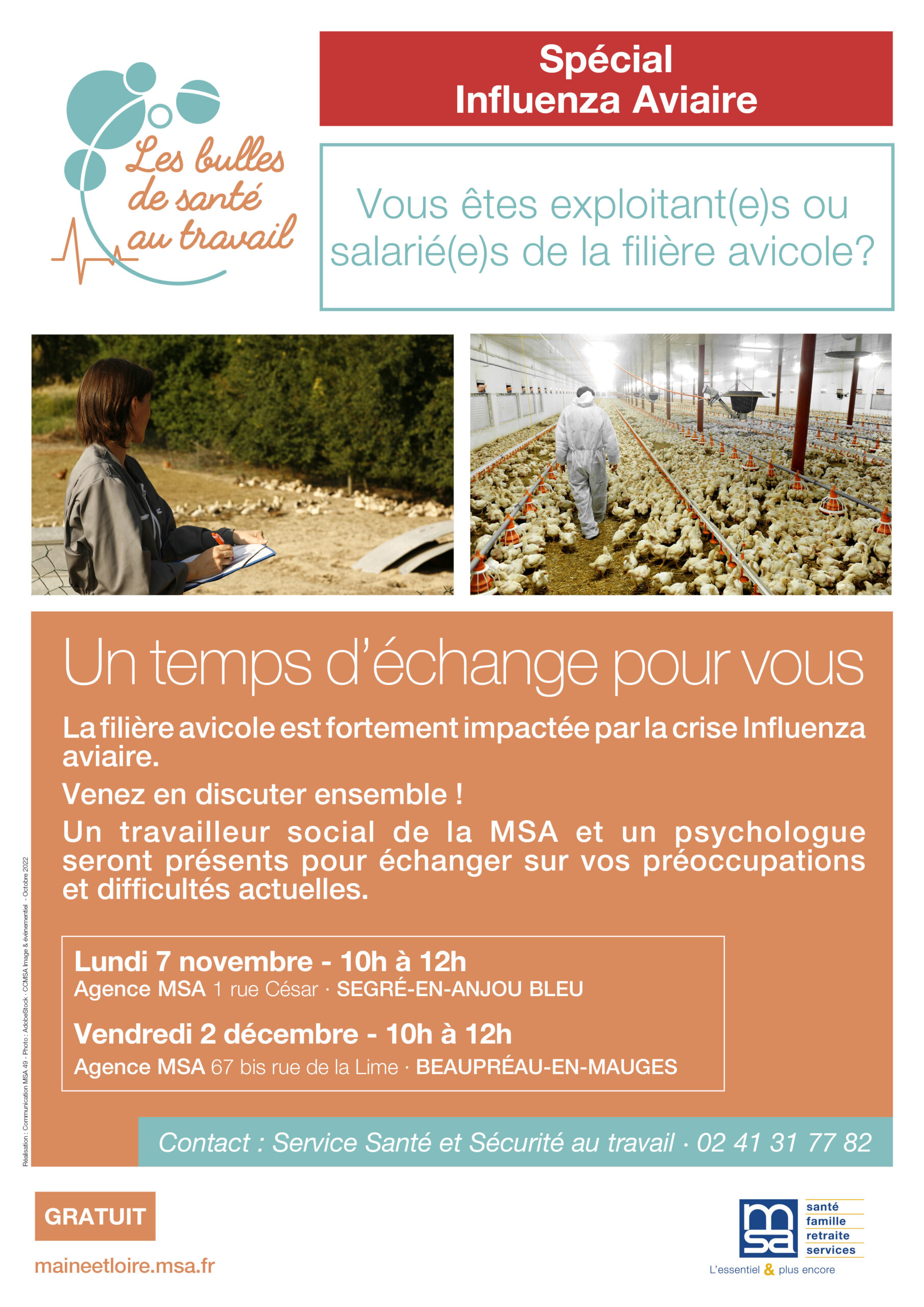 Les services Santé au Travail et Action Sociale MSA 49 proposent un temps d’échanges aux agriculteurs et leurs salariés pour partager ce qu’ils vivent autour de cette crise le vendredi 2 décembre de 10h à 12h à l’agence MSA de Beaupréau-en-Mauges, 67 bis rue de la Lime à Beaupréau.